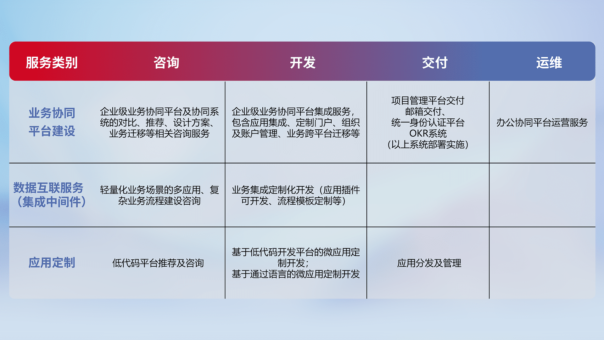 针对钉钉、、企微、、、、IDaas等平台级产品提供产品的规划、、、方案、、交付、、定制化开发等服务,,,实现如统一协同办公、、智能客户服务、、、、混合会议管理、、、智能数据查询、、、等业务场景,,实现数字化转型。。。。