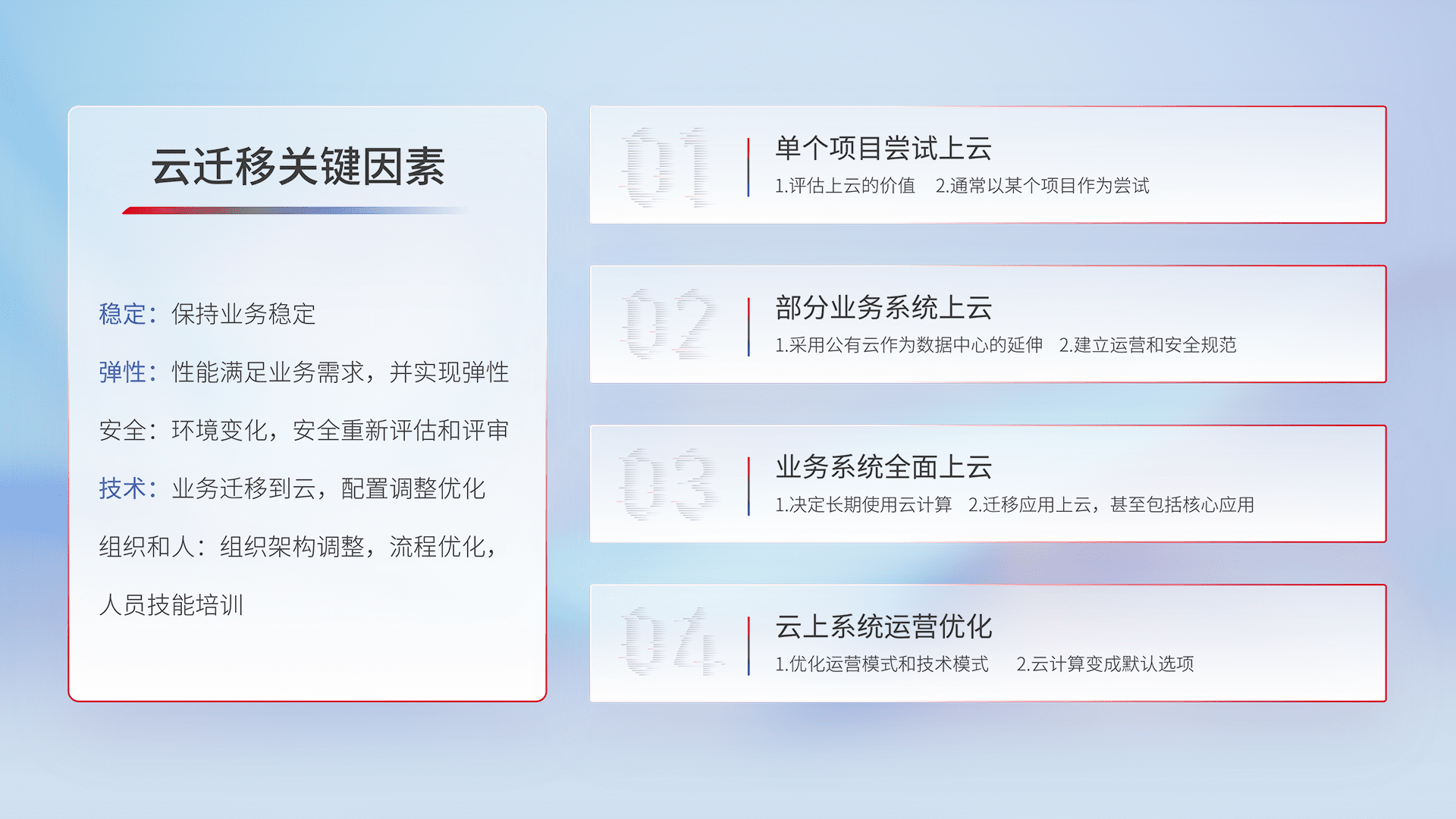 结合实际业务,,,从规划设计、、、云平台选型、、云原生改造、、数据迁移、、、集成交付,,迁移全过程为客户识别最佳上云路径,,,做好风险识别管理,,,设计网络架构、、身份权限、、、、安全审计合规、、、操作审计、、日志审计、、、监控告警策略、、多站点容灾设计等,,,对云上基础设施进行整体规划,,提升IT治理水平,,,,以满足弹性、、、高可用、、高性能的需求。。。。