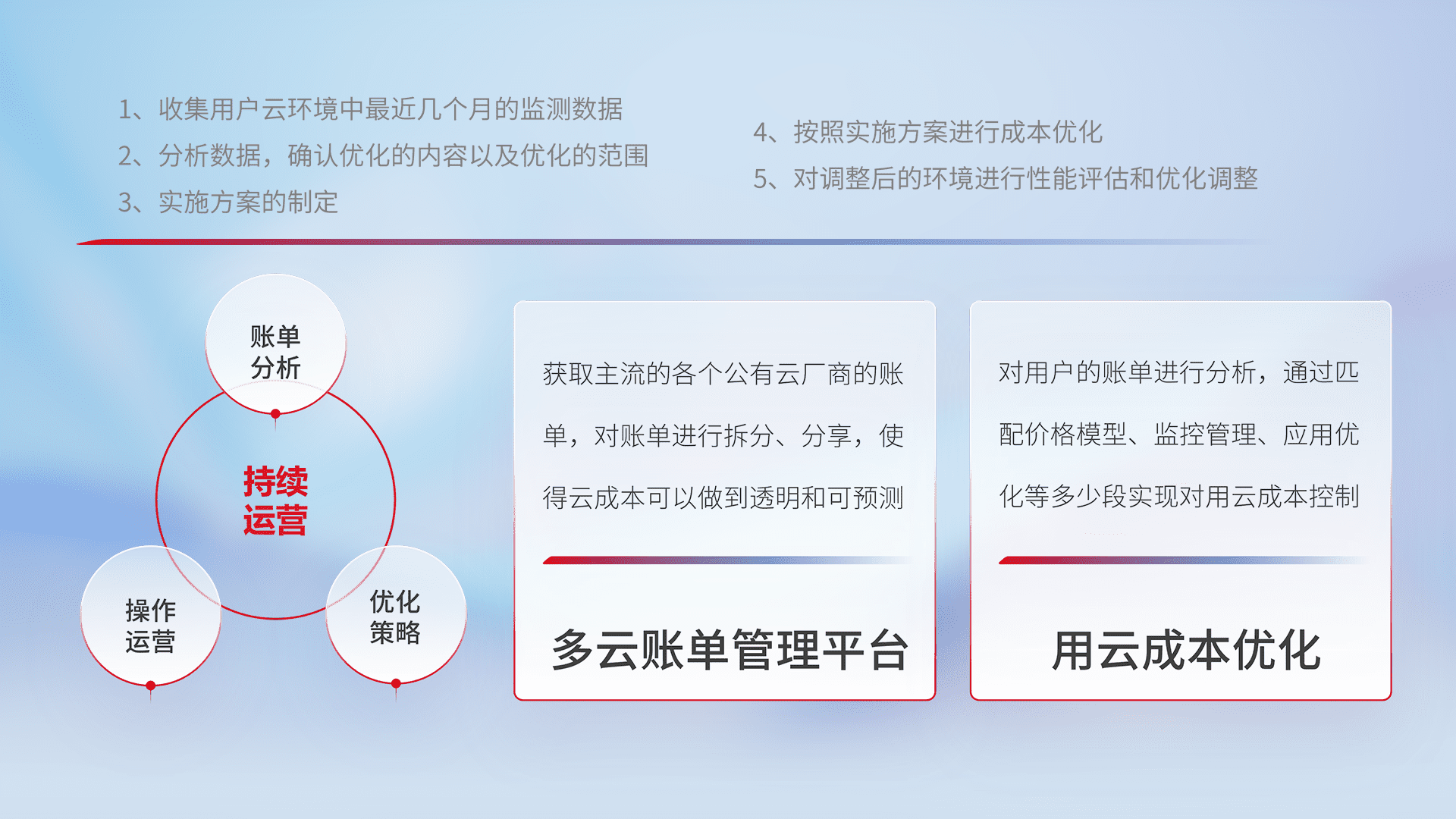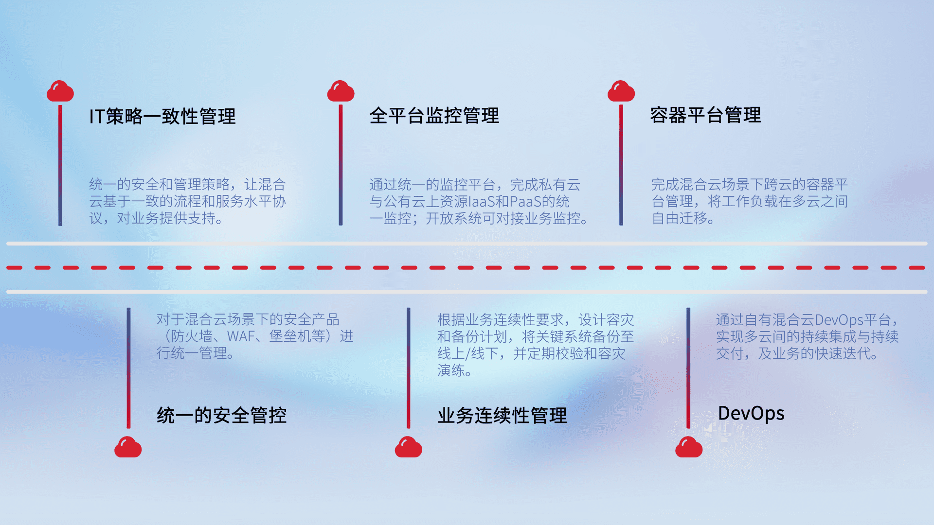 通过多云纳管,,以统一的资源数据模型把客户的云资源进行抽象和封装,,,进而实现对多云资源的统一操作,,,保障云资源管理的可靠性、、、、稳定性与可用性。。量身定制化运维内容,,,配置、、、、开发运维、、、、补丁管理、、、、备份、、、监控、、、、认证和访问管理、、审计和日常巡检等,,,,保障在用云过程中的可靠度,,,,稳定度以及高可用率。。