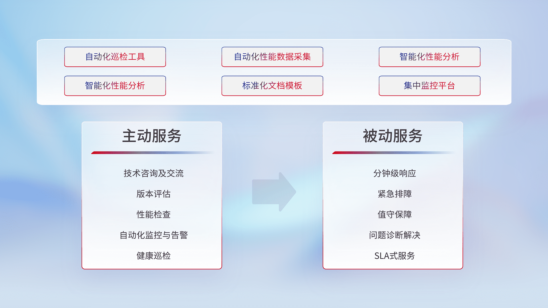 智能化工具和标准化文档,,保障服务质量,,,提供主动服务(包含技术咨询、、版本评估、、性能检查、、、、自动化监控与告警、、、健康巡检)和被动服务包含(分钟级响应、、、、紧急排障、、、、值守保障、、、、问题诊断解决、、SLA服务)。。。